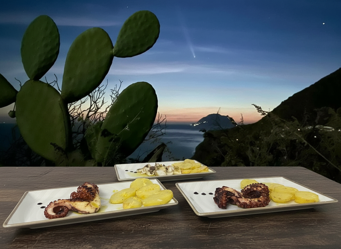 La cucina di A Lumera celebra le ricette eoliane e la tradizione filicudara. Ogni piatto nasce dal pesce fresco del giorno e da ingredienti locali, per offrire un’esperienza genuina e legata al mare.